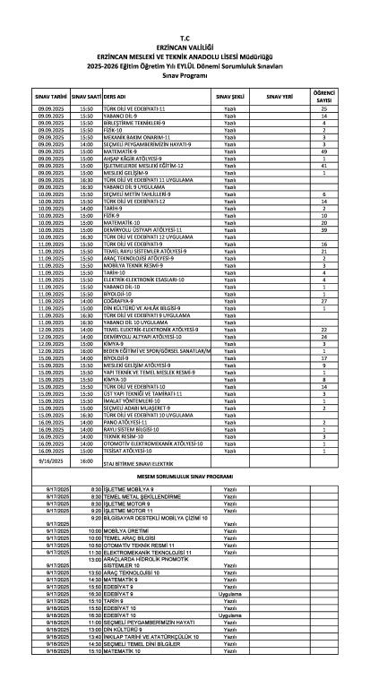 2025/2026 Eğitim Öğretim Yılı Eylül Dönemi Sorumluluk Sınavları