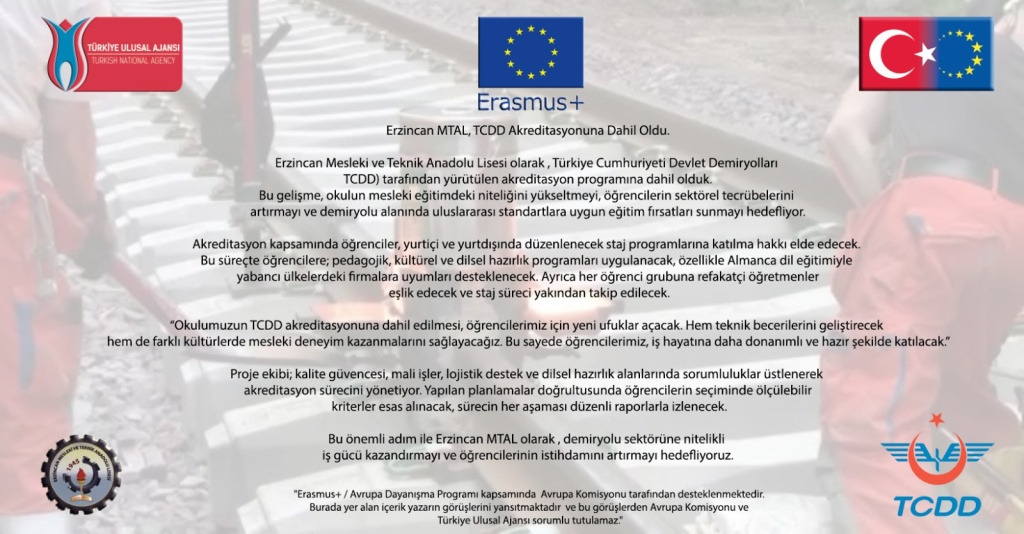 Erzincan Mesleki ve Teknik Anadolu Lisesi, Türkiye Cumhuriyeti Devlet Demiryolları (TCDD) tarafından yürütülen akreditasyon programına dahil oldu. TCDD. Akreditasyon Ekibine teşekkür ediyoruz. Bu gelişme, okulun mesleki eğitimdeki niteliğini yükseltmeyi, öğrencilerin sektörel tecrübelerini artırmayı ve demiryolu alanında uluslararası standartlara uygun eğitim fırsatları sunmayı hedefliyor.